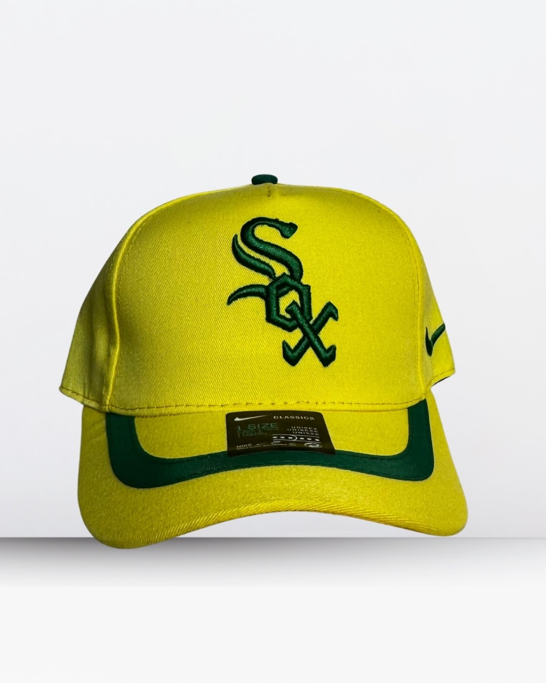 ¡Prepárate para robarte todas las miradas con esta gorra que irradia energía y estilo sin límites! ⚡️💚 Esta pieza es una explosión de color y actitud, diseñada para quienes no temen destacar y aman llevar un «drip» único. La corona en un amarillo vibrante y lleno de vida es el lienzo perfecto para el icónico logo «SOX» (aparentemente de los Chicago White Sox), bordado en un verde intenso y audaz que crea un contraste explosivo. ¡Es una combinación de colores que grita «statement» y te asegura ser el centro de atención!